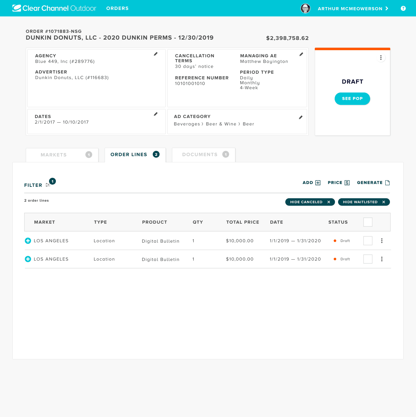 Clear Channel has their own order placing system, in which I have made several UI additions and UX updates. As this product is internal facing and serves our Account Executives mostly, the requests and requirements are provided by business operations stakeholders. While the UI framework is pretty rigid, I took the opportunity to improve the UX and UI through these feature additions and changes.
